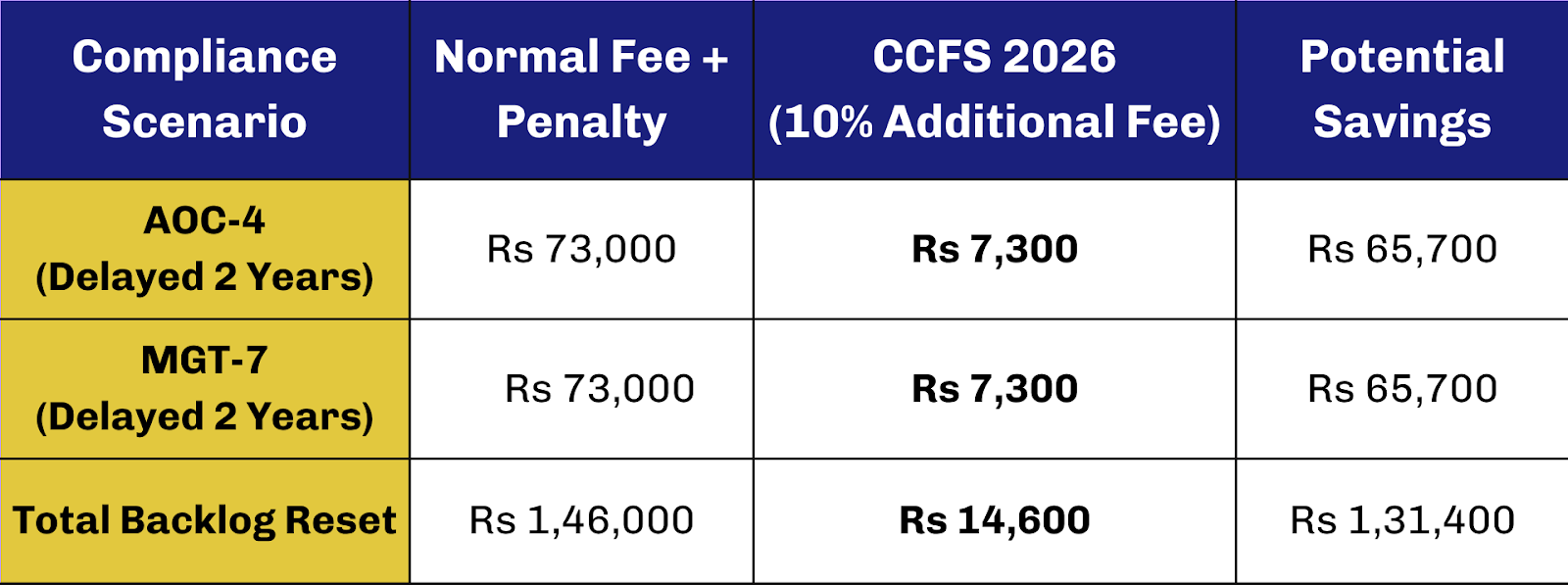 It’s a "pardon" period. Usually, you’d pay a penalty of Rs 100 per day, which adds up to thousands. Under the Companies Compliance Facilitation Scheme (CCFS) 2026, you get a 90% discount on those late fees if you file between 15 April and 15 July 2026. It's a "reset button" for your company's legal standing.